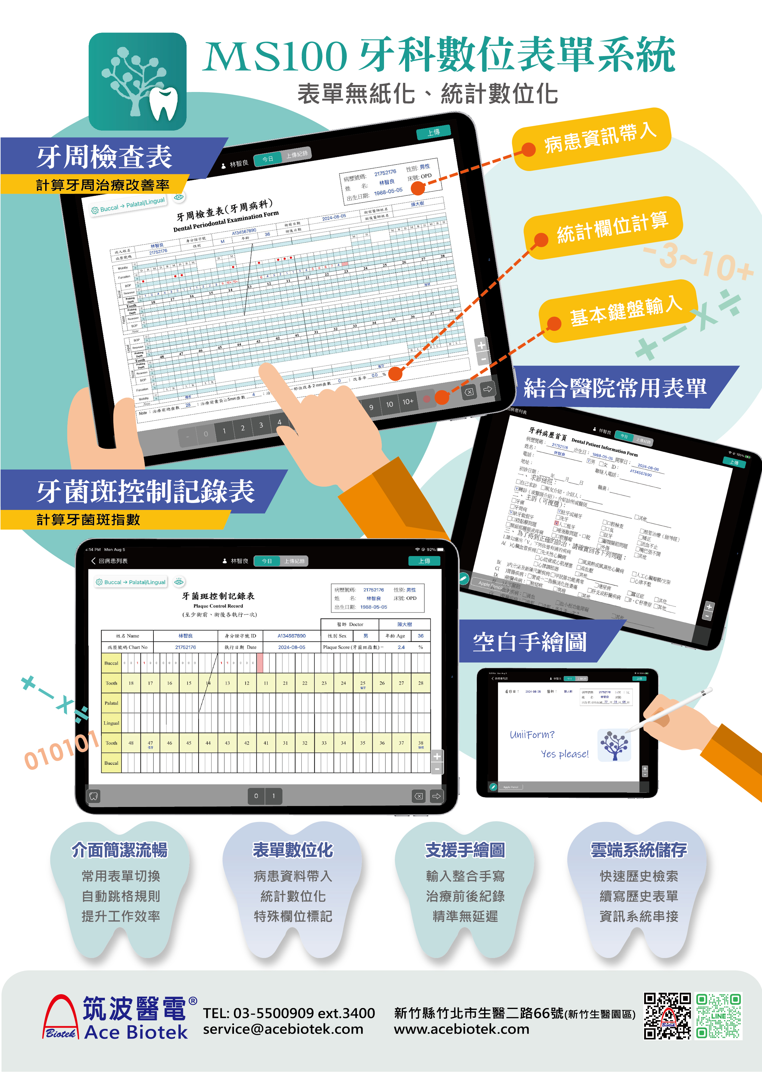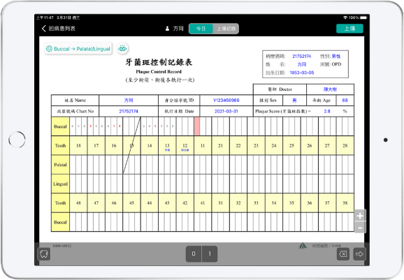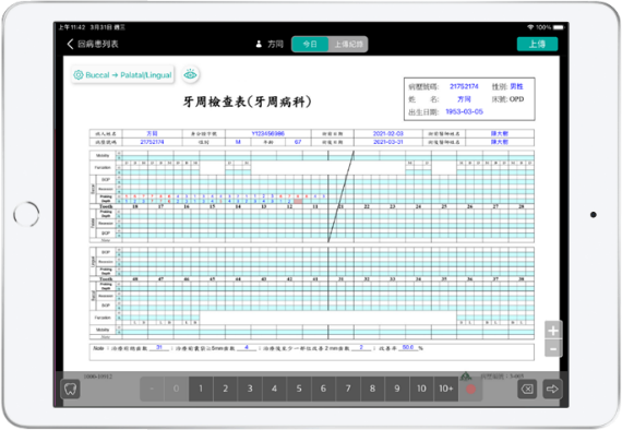DN100i平板系統:透過將牙周檢查表、牙菌斑控制記錄表、空白手繪圖等電子化表單的設計,呈現人性化界面,達到表單無紙化、統計數位化、資料結構化儲存。